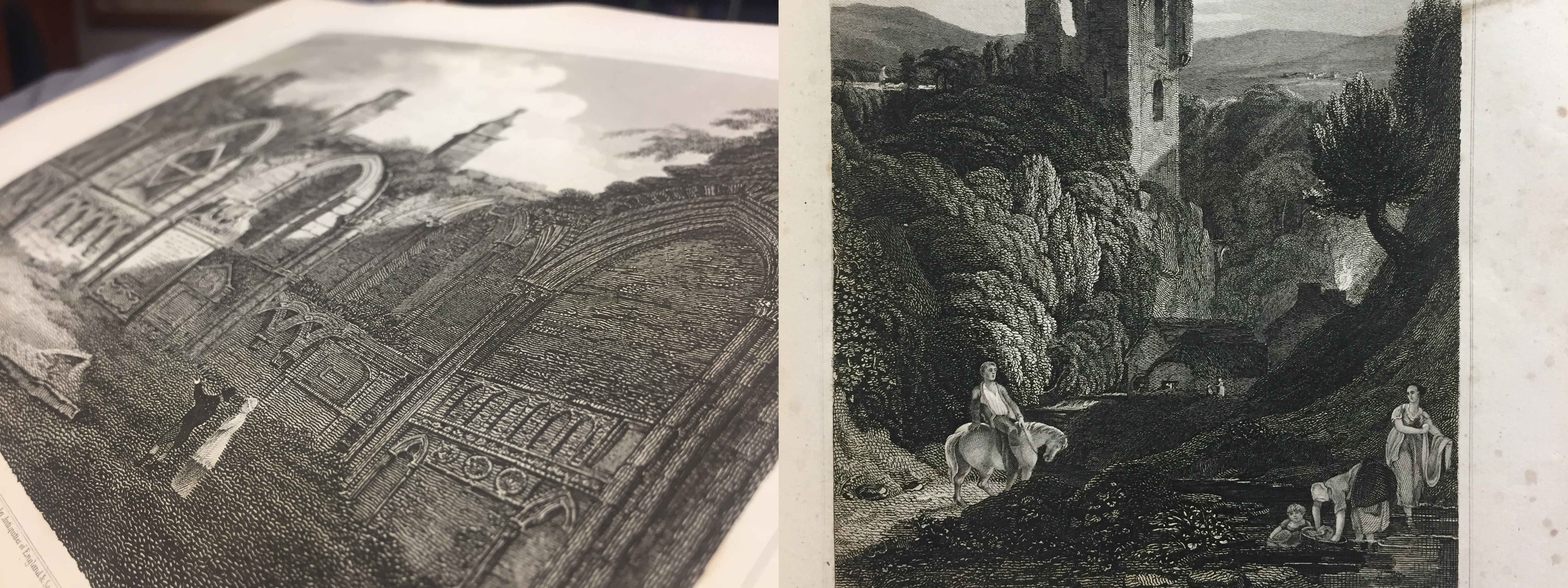 Not only do the engravings present clean and clear renderings of the structures described in the text, they also incorporate elements of the same romanticism that infuses Scott’s literature. Almost every one of Greig’s illustrations incorporates staffage, which gives a sense of scale and depth, whilst also an adding allegorical side notes to each illustration. The figures serve a dual purpose, technical and aesthetic, directing the viewer’s eye to significant points in the image while also creating a romantic context for the scene. A natural abundance is emphasised in each engraving with lush trees and shrubbery framing the historical monuments within a romantic landscape while also acting as a device to create atmospheric recession. Greig even includes incidental details like birds over water and interactions between figures which also help to create the sense that the scene captures a specific place and time. In contextualising the scenes for the viewer, these stylistic elements aid in the struggle towards achieving the illusion of three-dimensional space on the two-dimensional surface.